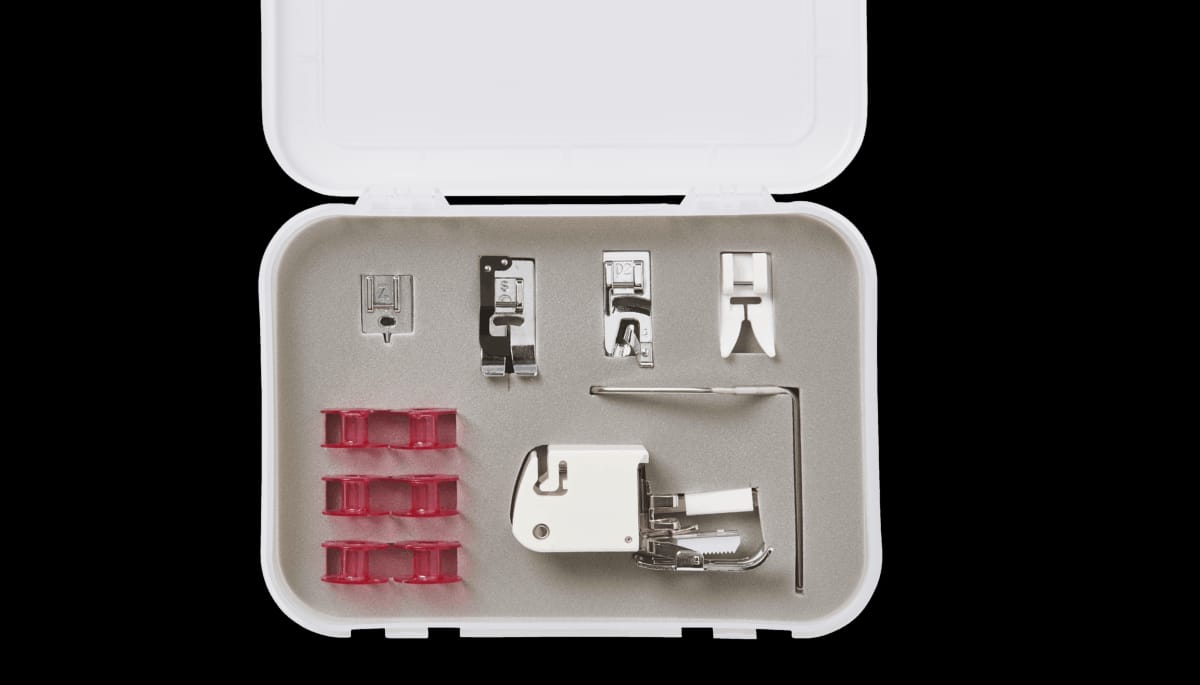 - Incluso nella confezione troverai anche un kit accessori completo con Walking Foot, piedini speciali e bobine, custodito in elegante box, insieme a un set di forbici firmato Yaya Han, perfetto per lavorare con precisione su ogni dettaglio.