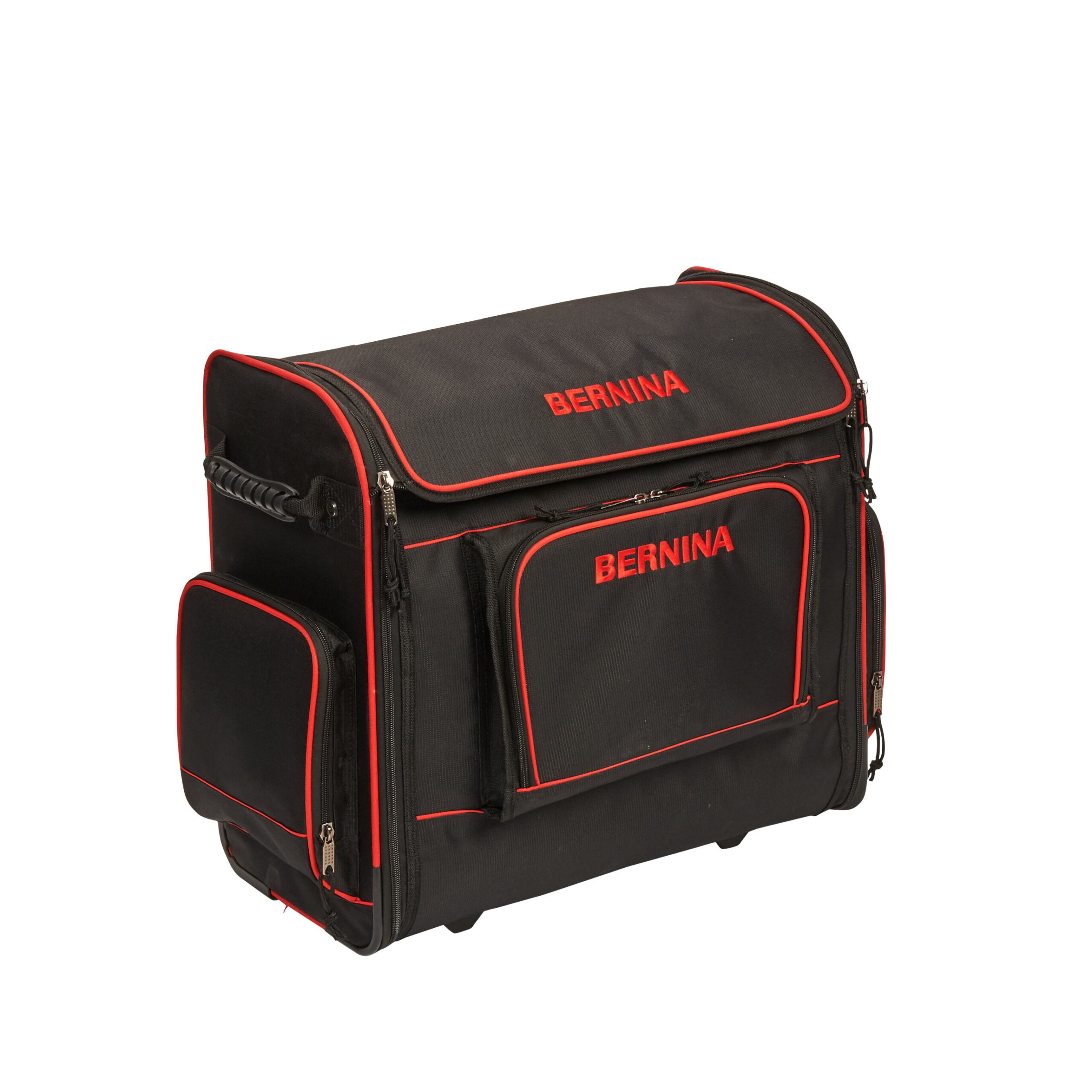 Le numerose tasche interne ed esterne offrono tutto lo spazio necessario per riporre gli accessori. Le robuste ruote e la maniglia telescopica estraibile ti consentono di trasportare la tua macchina per cucire e il relativo modulo per ricamo. Le maniglie laterali lo rendono più maneggevole durante i tuoi spostamenti. Tre inserti aggiuntivi fissati mediante velcro garantiscono il supporto ottimale per il trasporto delle macchine per cucire BERNINA di piccole dimensioni.